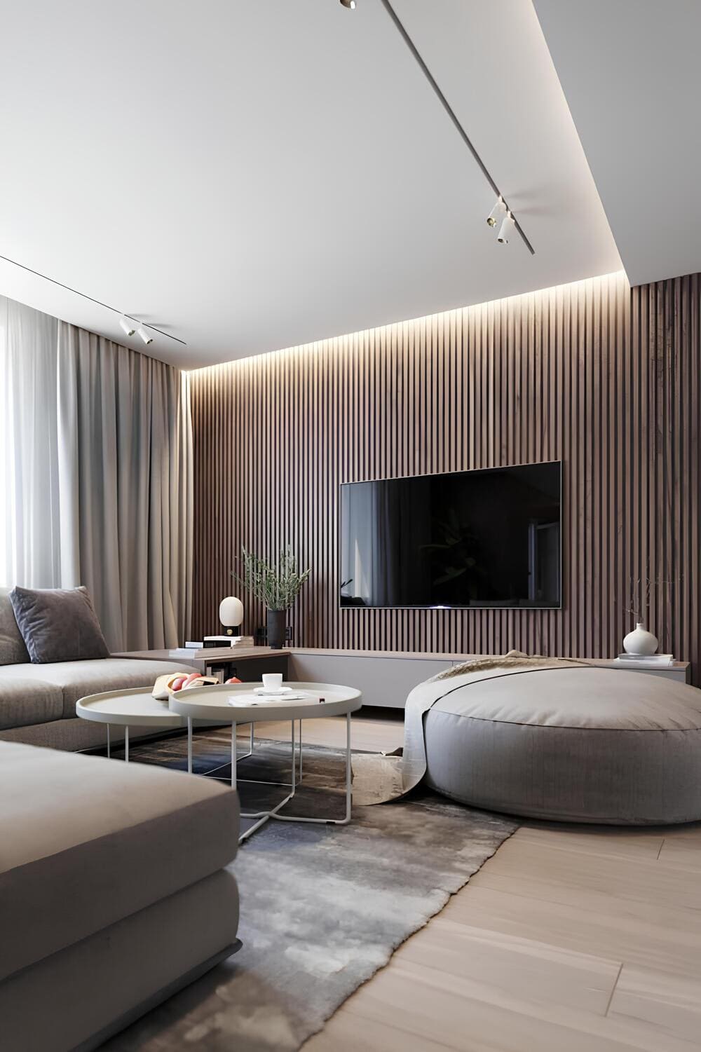 В 2025 году натяжные потолки в зал стали более простыми и стильными, часто с одним или двумя уровнями. Обычно их делают из белого ПВХ или ткани. Особое внимание теперь уделяется освещению: обычная люстра в центре уходит в прошлое, её заменяют более современные варианты. Всё чаще комбинируют разные источники света, что помогает создать уютную атмосферу в комнате.