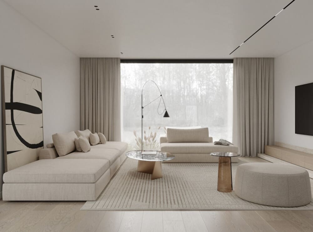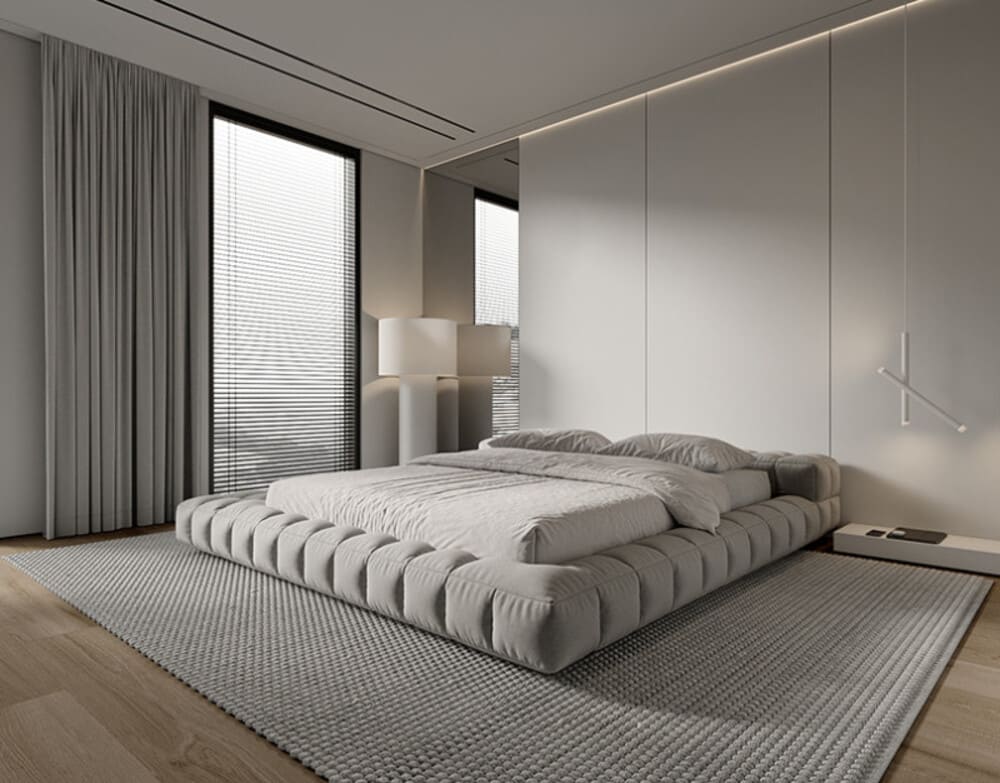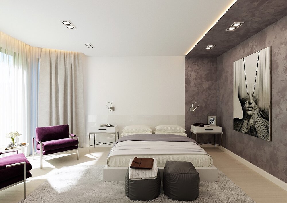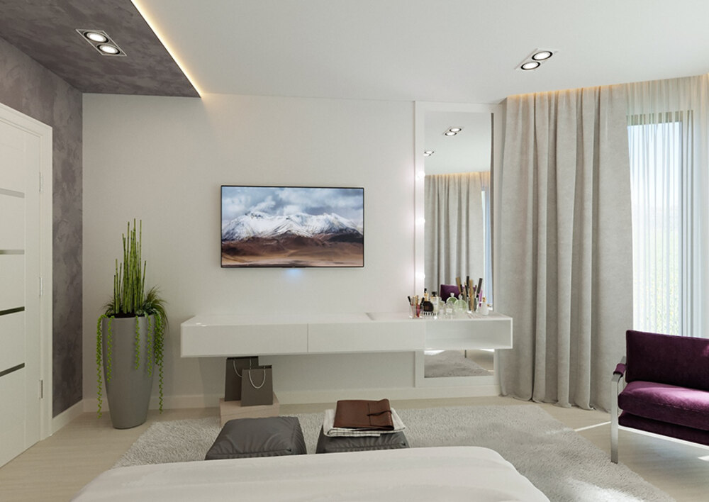 Классический минимализм предполагает светлый матовый потолок. Для его создания лучше всего подойдет тканевое полотно. Его также можно покрасить в тот же оттенок, что и стены для достижения полного единообразия.